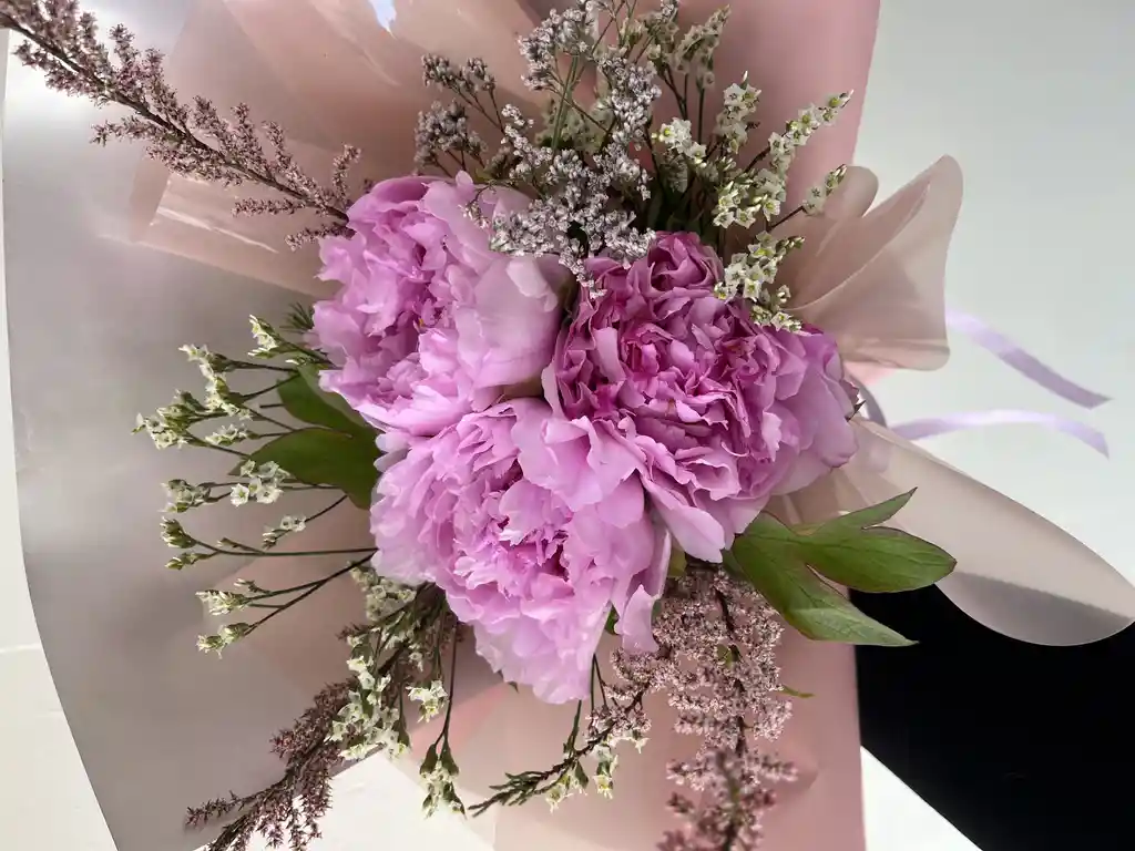 . Delicado ramo para sorprender con esta flor tan diferente y fina , ideal para regalo de Amor ,Cumpleaños,, Aniversario o simplemente por regalar . Incluye: - 3 Peonias frescas - Follaje de estación - Papelería Coreana - Tarjetita de mensaje .
