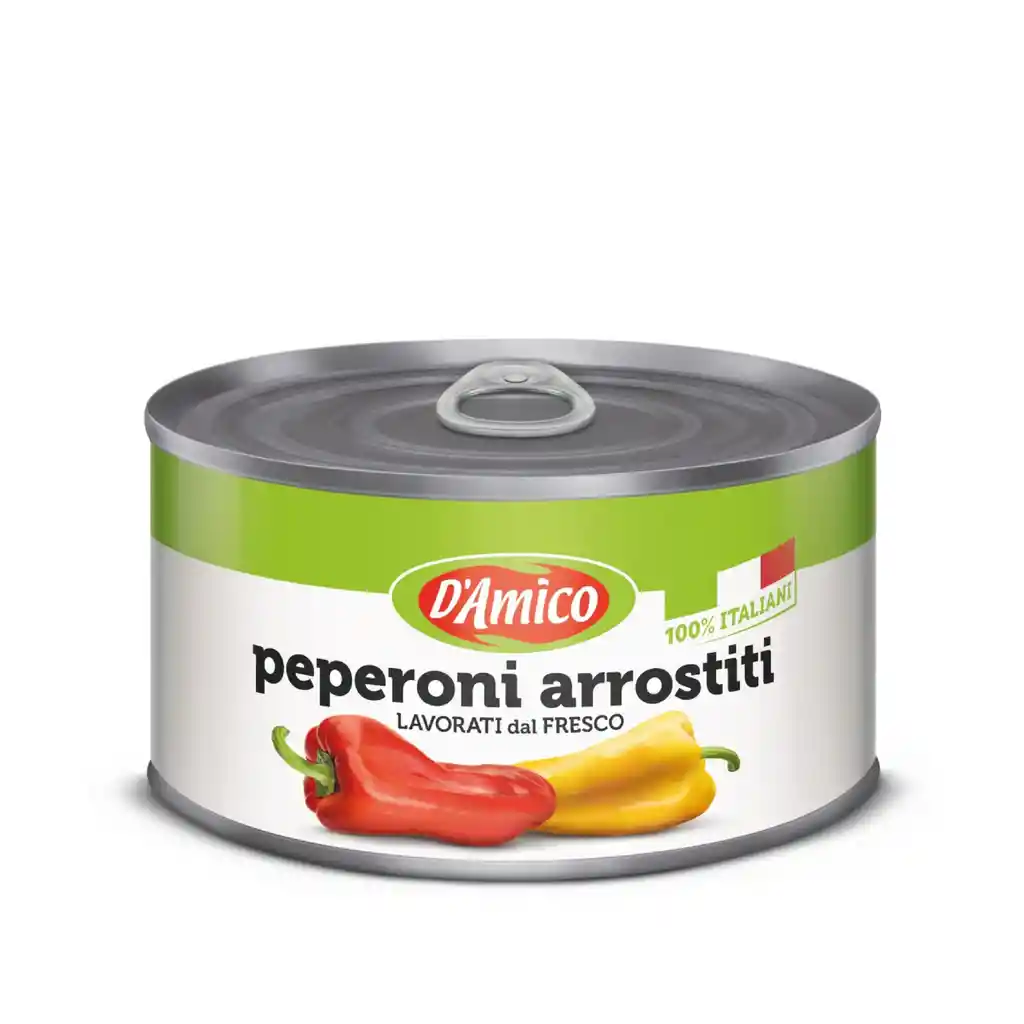 Pimientos italianos pelados, enteros, frescos y asados. Ingredientes principales: Pimientos, agua, Azucar, sal y otros. 350 gr drenados. Hecho en Italia.