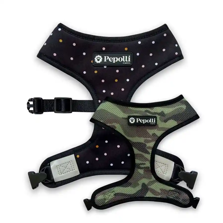Estilo europeo que marca tendencia en la moda para perritos. Seis accesorios en el mismo exclusivo diseño = infinitas combinaciones. Nuestro arnés 2-EN-1 Pepolli es reversible, cada lado destaca por su único y llamativo diseño. 2 estilos en 1 arnés, úsalo por el lado que desees. Fabricado con altos estándares de calidad y comodidad, se caracteriza por ser liviano, suave, resistente y seguro. Características y beneficios: Confeccionado con Neopreno y Airmesh: Suave, resistente, transpirable, de secado rápido y muy cómodo de usar. Se puede humedecer para dar frescura extra en días de calor. La resistencia de este material, lo hace durable en el tiempo y fácil de limpiar. No posee costuras: Es altamente resistente a tirones, lo que lo hace más seguro y no tiene puntos de contacto que dañen la piel por roces. Zonas reflectantes: Mejoran visibilidad nocturna, brindando mayor seguridad y evitando accidentes. Correas ajustables: Puede ajustarse en el área del estómago, otorgando mejor adaptación al tamaño de tu perrito. Instrucciones de cuidado: Lavar a máquina 30°, no apto para secadoras.