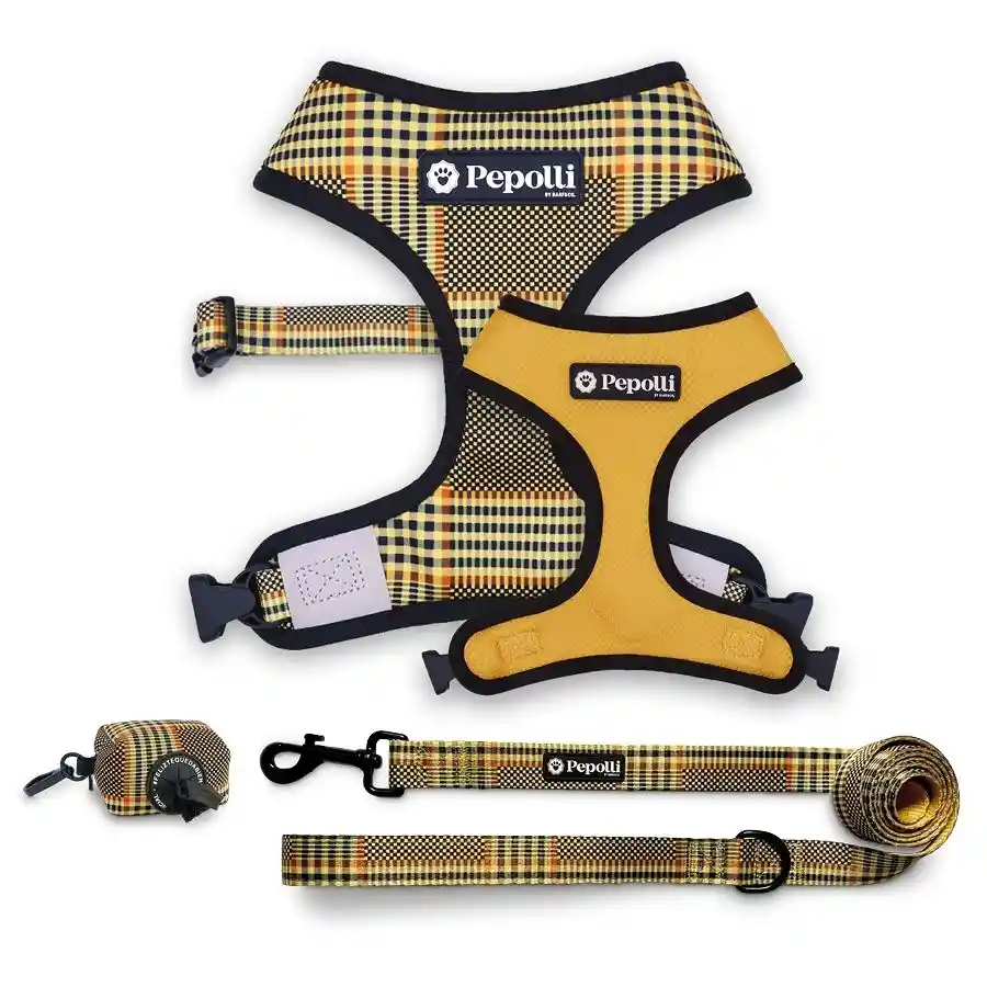Estilo europeo que marca tendencia en la moda para perritos. Seis accesorios en el mismo exclusivo diseño = infinitas combinaciones. Cada accesorio de este especial set ¡Es 2-EN-1! Nuestro arnés y correa 2-EN-1 Pepolli , destacan por tener 2 estilos en 1 accesorio, cada lado es único y llamativo. El arnés es reversible, puedes usarlo por el lado que desees. Ambos son la combinación perfecta junto a nuestro “Poop”. El “Poop” Pepolli 2-EN-1 es dispensador de bolsas y al mismo tiempo, contenedor de golosinas, ideal durante el paseo. Características y beneficios: Arnés: Confeccionado con neopreno y Airmesh: Suave, resistente y transpirable. No posee costuras Zonas reflectantes Correa: Mango acolchado de neopreno: Comodidad y suavidad. Exterior de poliéster: Tejido en 2 capas, otorga más resistencia. Anillo en D: Incorporado para colgar dispensador de bolsas “Poop” Poop: Fabricado en neopreno de alta calidad Mosquetón metálico: Anclaje para anillo en D de correa. Incluye rollo de bolsas: Listo para usar. Estos tres productos son la combinación ideal para un paseo seguro, cómodo y con estilo.
