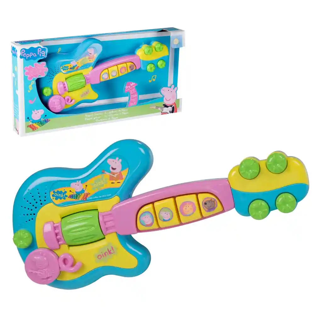 Regálale a tu bebe su primera Guitarra Eléctrica Peppa Pig, la cual cuenta con melodías y sonidos estimulantes que lo motivarán, brindándole mucha diversión y entretención en sus primeros meses. Esta, además, es ideal para los pequeños músicos, es muy sencilla de usar, presionando los botones y girando el dial podrán escuchar los sonidos de guitarra y al mover la cola de Peppa también escucharán sonidos musicales. Este juguete estimula los sentidos auditivos de tu bebé, mientras desarrolla también diferentes habilidades, como la coordinación mano-ojo y la relación causa/efecto. Requiere 2 pilas AA incluidas con fines demostrativos.