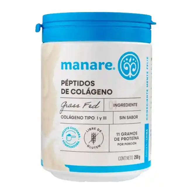 Los Péptidos de Colágeno Manare, provenientes de vacas de libre pastoreo, ofrecen una solución práctica y de alta calidad para incorporar proteínas y nutrientes esenciales a tu rutina diaria. Su fórmula se disuelve en segundos sin formar grumos, facilitando su integración en tu dieta sin alterar el sabor de tus comidas. Excelente fuente de proteínas y aminoácidos que el cuerpo asimila fácilmente. Proveniente de animales de libre pastoreo. De rápida disolución y absorción. Neutro en sabor y olor, perfecto para añadir a cualquier comida o bebida. Libre de gluten. Incluye cucharita dosificadora. Cada porción ofrece 11 gramos de proteínas. Compatible con dietas Keto y Paleo. Contiene aminoácidos esenciales como leucina, lisina, valina, entre otros, que son fundamentales para la salud. Colágeno tipo I y III: Tipos de colágeno más abundantes en el cuerpo humanos y sus tejidos. Ayuda a la recuperación de tejidos como piel, tendones, vasos sanguíneos, piel, etc. Versátil en la cocina, puedes incorporarlo en cafés, tés, jugos, batidos, sopas, o incluso en recetas de repostería. - Ingredientes: Péptidos de colágeno bovino. - Se recomienda conservar en un lugar fresco y seco. Mantener en su envase bien cerrado.