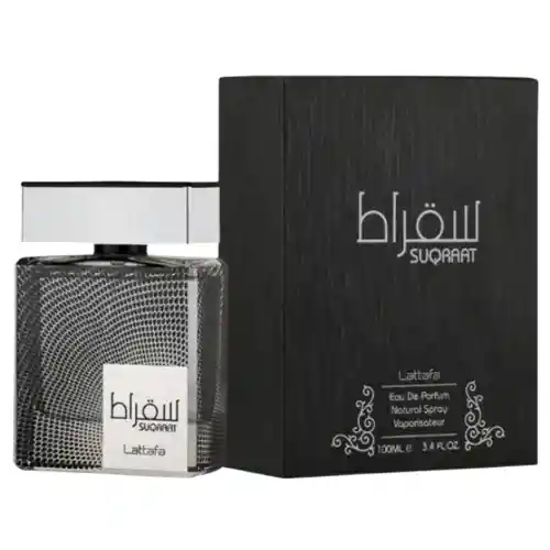 Lattafa Suqraat EDP 100 ML, perfume masculino con notas amaderadas, especiadas y orientales. Elegancia, sofisticación y aroma duradero para cualquier ocasión.