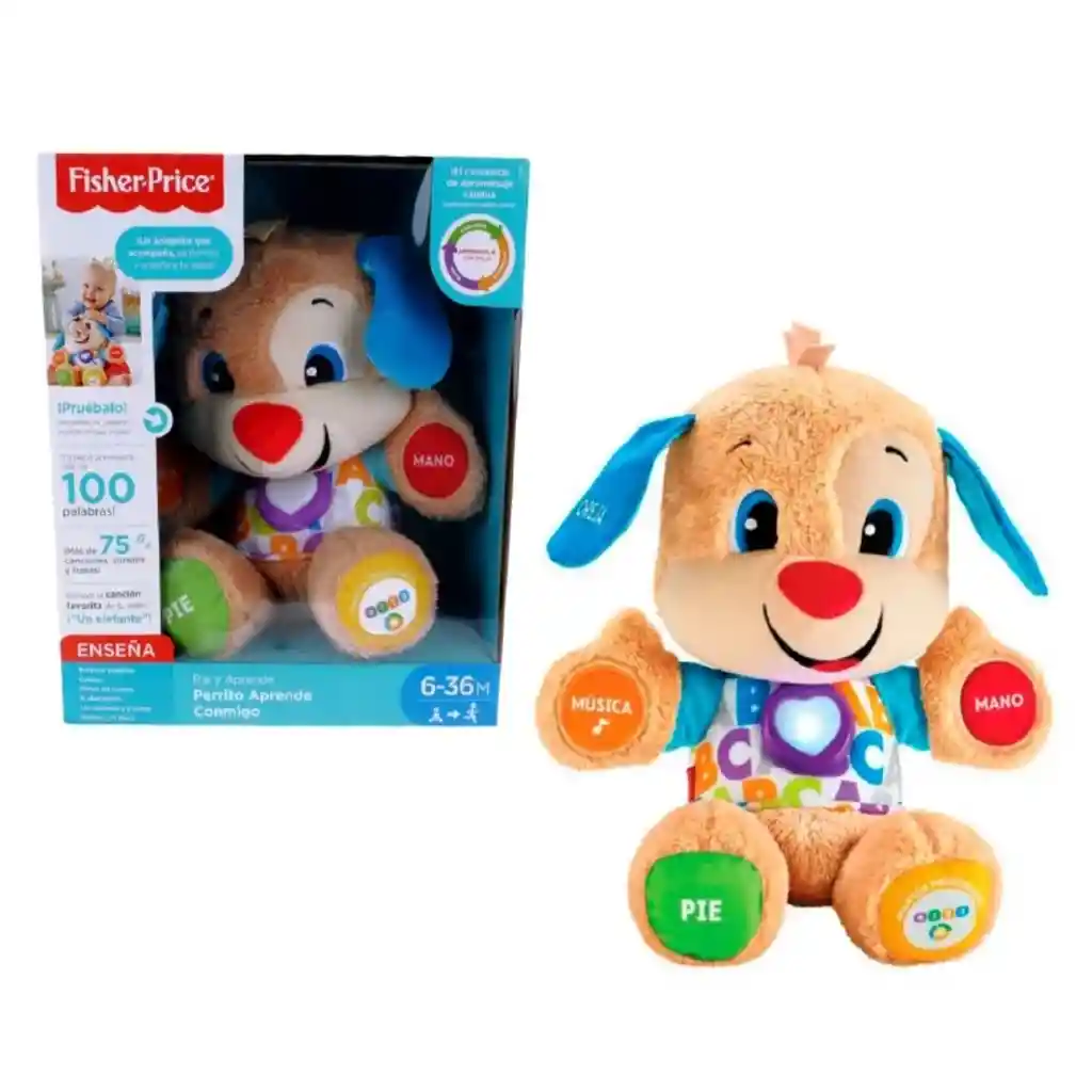 Perrito Aprende Conmigo Ríe y Aprende Fisher Price Regálale a lo más pequeños de la casa, su primer mejor amigo. Perrito es un peluche muy tierno, suave y está listo pasa asegurarse de que la diversión de aprender nunca termine. Responde al toque de tu bebé con emocionantes canciones y frases que introducen más de 100 primeras palabras, le enseña además las partes del cuerpo, colores, formas y mucho más. Ya que cada pequeño se desarrolla a su propio ritmo, Perrito cuenta con una tecnología de Aprendizaje por etapas, así podrás elegir el nivel que mejor se adapte al bebé. El tierno corazón de Perrito se ilumina al ritmo de la música. Crecer y aprender nunca había sido tan divertido.