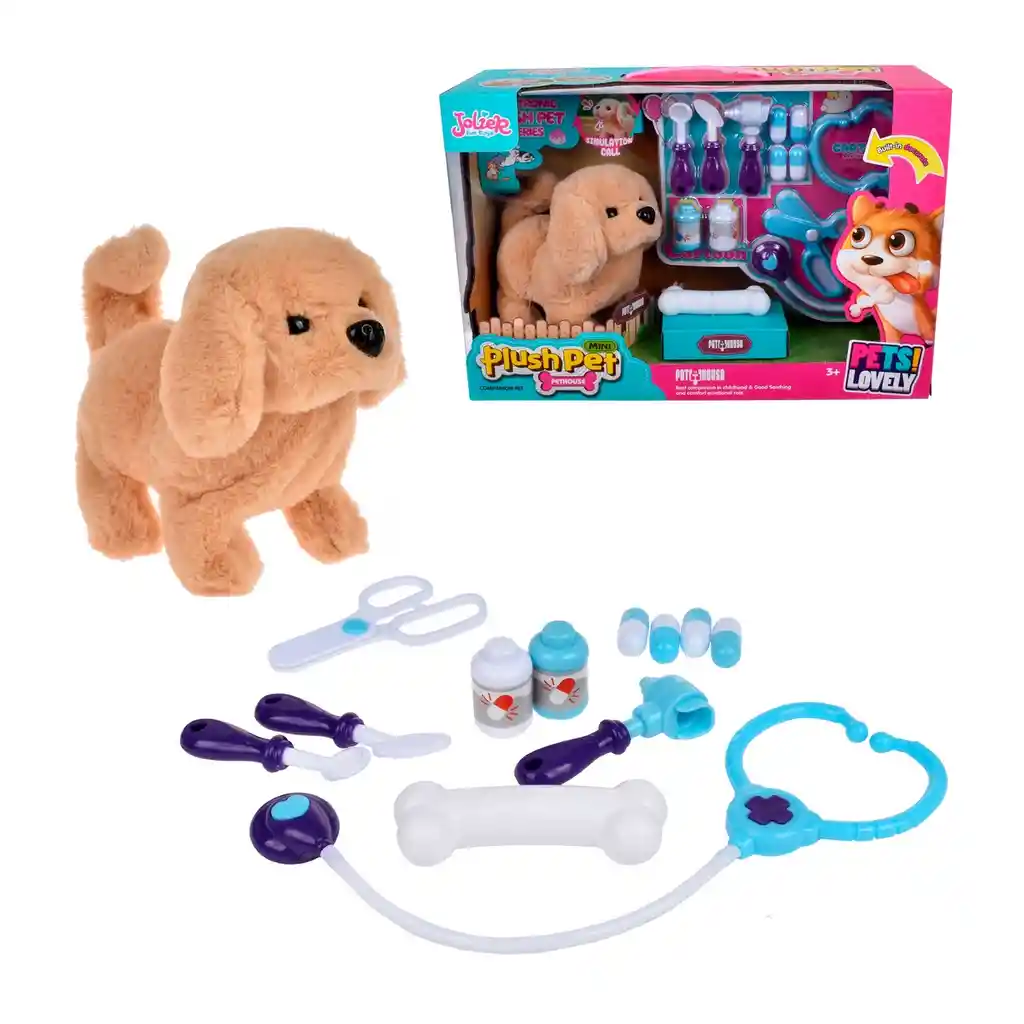 ¡Regalonea a los más pequeños de la casa, haciéndoles un regalo muy especial! El perro peluche que camina y ladra, viene con un set de veterinaria para que los niños jueguen a cuidarlos y mimarlos ganándose su lealtad y amor. Este set es ideal para que los niños aprendan a cuidar a las mascotas mediante un juego recreativo e interactivo, lo mejor es que podrán transportarlo a donde quiera que vayan acicalando y mimando a su nuevo mejor amigo. Este juguete promueve en los niños la responsabilidad, el desarrollo de la comprensión causa/efecto y fomenta la confianza, la amistad y el desarrollo lingüístico. El perrito requiere de 2 pilas AA, no incluidas.