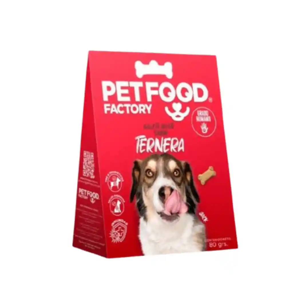 Pet Food Factory Galleta Hueso Ternera es un delicioso snack para perros en forma de hueso con textura de galleta con sabor a ternera y textura crujiente y deliciosa, con grado humano. Ingredientes: Harina de trigo, agua, harina de soya, harina de maíz, grasa animal de cerdo, salvado de trigo, jarabe de glucosa, inulina, sal, leudantes (bicarbonato de amonio, bicarbonato de sodio, fosfato monocálcico), colorante caramelo 150d, mix probióticos (Bacillus coagulans y bacillus subtilis) y bañado de aceite vegetal refinado de maravilla con saborizante idéntico al natural ternera. Beneficios: Contiene Pre y Probiótico. Mejora la salud digestiva. Refuerza el sistema inmunológico. Grado Humano: Elaborado con ingredientes que cumplen los estándares de calidad para consume humane, seleccionados cuidadosamente para asegurar la máxima seguridad y nutrici6n en la alimentaci6n de las mascotas.