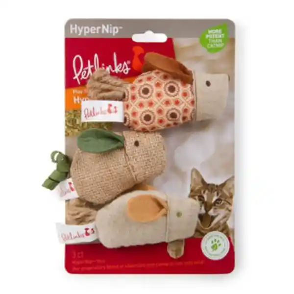 Convierte el Tiempo de Juego en Tiempo Efectivo de Persecución Ideal Para Estimular el Ejercicio y la Movilidad en tu Amigo Felino. Este Trio de Ratones Está Confeccionado Con Yute Natural y Diseñado Con Cintas y Orejas Largas Que Estimularán Los Instintos Naturales de Caza de tu Gato Además Está Lleno de Hypernip Una Mezcla de Silvervine y Catnip Que Puede Inducir Momentos Llenos de Actividad Seguidos de Periodos de Relajación y Tranquilidad y Además el Juguete Incorpora Materiales Sostenibles Orgánicos y Seguros Para el Juego Diario. Beneficios: Estimulante Juguete Emocionante y Atractivo Que Estimula Los Instintos Naturales de Caza de tu Gato. Relleno Con Hypernip Mezcla de Hierbas Gateras Que Resulta Mas Atractiva Que el Catnip Tradicional. Diseño Ligero Por lo Que Los Gatos Pueden Recogerlos y Arrojarlos Desbordando su Energía Contenida. Hecho Con Materiales Reciclados y Naturales Que Logran un Juego Saludable y Emocionante. El Hypernip Puede Inducir Estallidos de Intensa Actividad Seguidos de Periodos de Calma y Relajación..