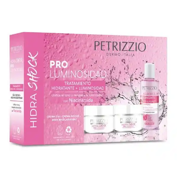 Pack Petrizzio Contiene 3 Unidades. Petrizzio Crema Pro Luminosidad Dia + Petrizzio Crema Noche + Petrizzio Agua Micelar Rosas.