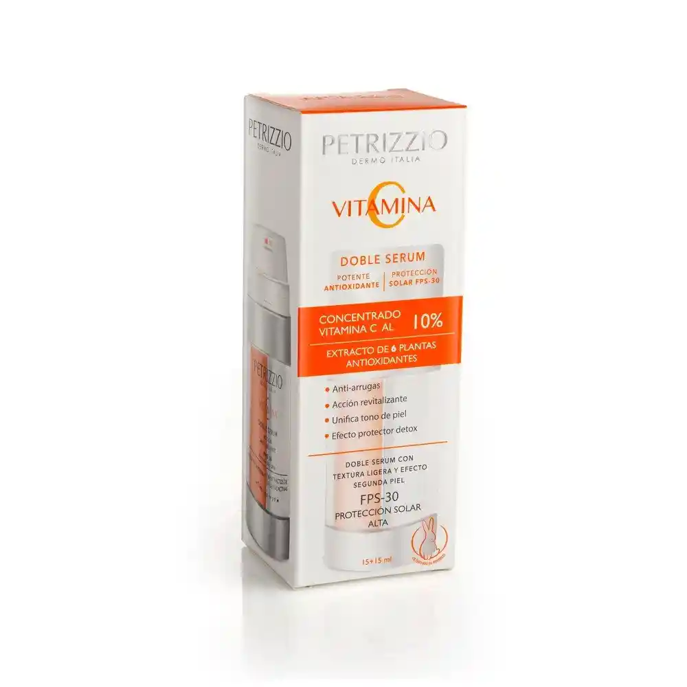 Sérum de doble acción con textura ligera. Su sistema de doble cámara contiene: por un lado, 10 % de vitamina C pura y en el otro crema con factor de protección solar alto FPS 30 más extractos de plantas naturales antioxidantes. Es anti-arrugas, tiene acción revitalizante y unifica la piel.
