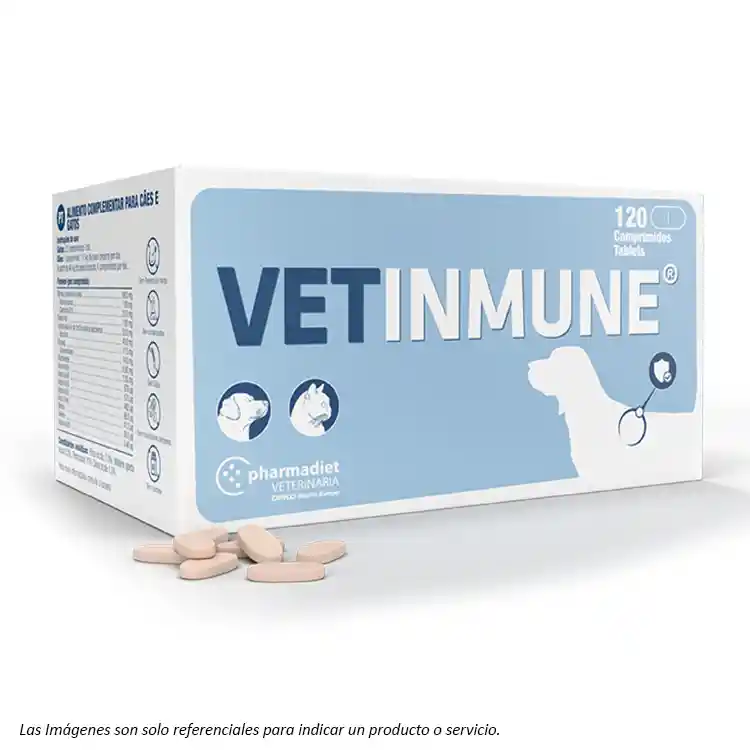 Suplemento en comprimidos Vetinmune de PharmaDiet para Perros y Gatos de todas las edades y razas que necesitan Reforzar su Sistema Inmune. Contiene Beta-glucanos, Extracto de Ginseg, Baicalina, Coenzima Q-10 y Vitaminas, cuya combinación de nutrientes ayudan al funcionamiento normal del Sistema Inmunitario. Indicado para los siguientes casos: *Mantener el funcionamiento normal del Sistema Inmune. *Ayuda a combatir los efectos asociados a la leishmaniosis. *Disminuye los ciclos y procesos infecciosos de ciertas patologías. *Reduce la propabilidades de contagios infecciosos. *Disminuye Brotes de enfermedades. *Potencia y refuerza el sistema Inmune. Producto Libre de Proteína de Pollo, Colorantes y conservantes artificiales.