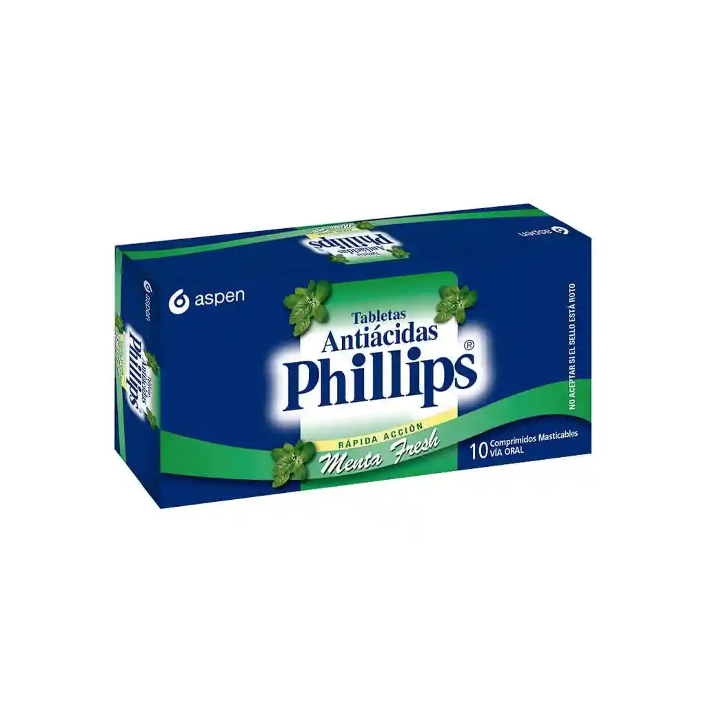 Principio Activo: Carbonato de Calcio - Complejo de Hidróxido de Aluminio y Sorbitol - Hidróxido de Magnesio / Forma Farmacéutica: Comprimido Masticable / Dosis Por Forma Farmacéutica: 805 mg - 115 mg - 100 mg. ¿Para Qué Enfermedades o Condiciones se Prescribe Este Medicamento? Antiácido Para el Alivio de Los Síntomas de Acidez Estomacal. ¿Cómo Debo Usar Este Producto? (Posología) Vía Oral. Masticar Completamente el Comprimido. Dosis Adultos: 1 a 2 Comprimidos Masticables, Según Sea Necesario. Máximo 10 Comprimidos al Día. Presentación Phillips Menta Viene en Formato de Comprimidos Masticables, el Envase Contiene 10 Unidades. Condiciones de Almacenamiento Almacenar a no Más de 25°C., Protegido Del Calor, la Luz y la Humedad. Mantener Alejado de Los Niños. Principio Activo (Nombre Genérico) Carbonato de Calcio / Complejo de Hidróxido de Aluminio y Sorbitol / Hidróxido de Magnesio. Advertencias de Uso no Administrar a Niños Menores de 12 Años, Mujeres Embarazadas o Que Amamantan, Salvo Que el Médico se lo Indique. Este Medicamento Sólo Debe Tomarse Cuando Hay Molestias. No Usar la Dosis Máxima de Este Producto Por Más de 2 Semanas, a Menos Que lo Indique el Médico. En Todos Los Casos de Sospechar Una Sobredosis Debe Consultar al Médico. Precaución en Diabéticos. No Tome Este Medicamento Sin Antes Consultar al Farmacéutico si Ud. Presenta Alguna Alergia ya Sea a Otro Medicamento, Colorante, Edulcorante o Saborizante. No Tome Este Medicamento Por Más de 14 Días, si Los Síntomas Persisten o Empeoran, Consulte al Médico. Dosificación Cada Comprimido Masticable Contiene: Carbonato de Calcio 805 mg. Complejo de Hidróxido de Aluminio y Sorbitol 115 mg. Hidróxido de Magnesio 100 mg. Reacciones Adversas si Casualmente Presenta Cualquiera de Estos Efectos: Constipación, Diarrea, Pérdida de Apetito, Náuseas o Vómito, Suspenda su Uso y Consulte Con su Médico. Contraindicaciones Hipersensibilidad a Alguno de Los Componentes de la Fórmula. No Usar en Caso de Dolor Abdominal, Vómitos, Fiebre e Insuficiencia Renal o en Casos de Debilitamiento Severo. Condición de Venta Venta Libre.