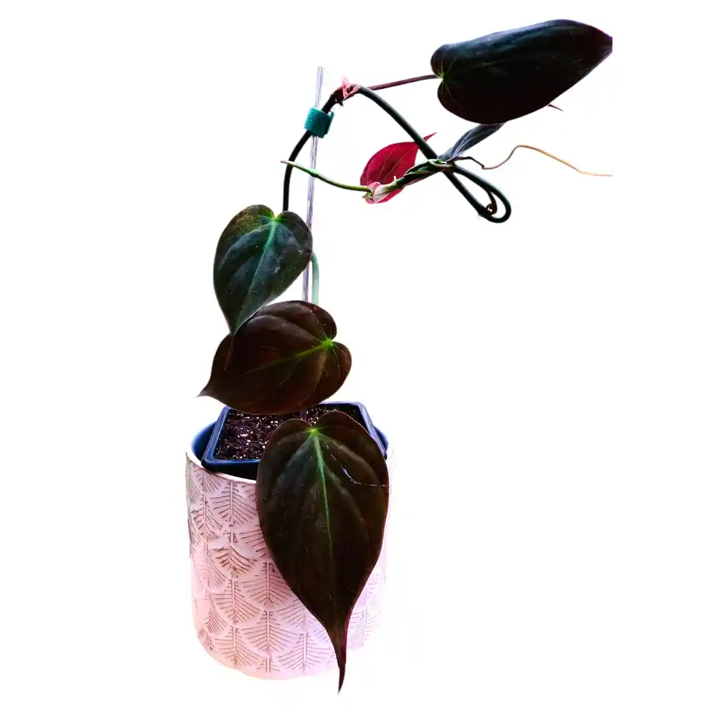 Philodendron Micans. \n \nAñade un toque de lujo aterciopelado a tu hogar con este impresionante Philodendron Micans (también conocido como Philodendron hederaceum Micans). Sus hojas en forma de corazón son suaves al tacto y tienen una textura casi acolchada, con un brillo iridiscente que cambia de tonos verde oscuro a ricos púrpuras o bronces según la luz. Es una planta de interior muy apreciada por su facilidad de cuidado y su crecimiento colgante o trepador, ideal para estanterías altas o para guiar en un tutor. \n \nGuía Rápida de Cuidados: \n \nLuz: Prefiere luz brillante e indirecta o semisombra nunca exponer al sol directo, ya que quemaría sus hojas. \n \nRiego: Regar cuando la primera capa de sustrato esté seca. \n \nHumedad: Lo ideal para todas las plantas tropicales tener un 60% de humedad como promedio. \n \nTip Plantlovers: Mantén sus hojas limpias para que tu plantita crezca con más fuerza. \n \n \nPlanta tóxica, no es Petfriendly 🐶🐱