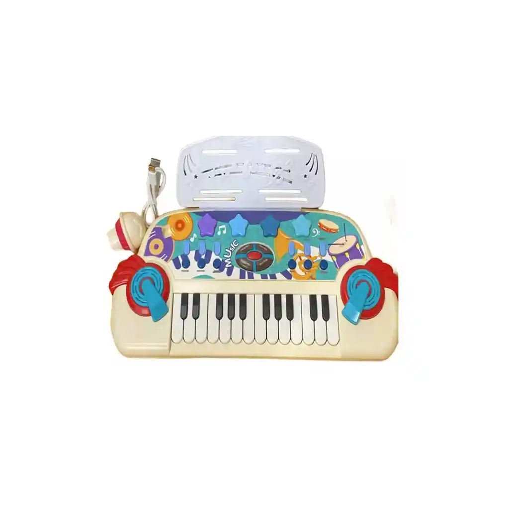 Descripción Del Producto: Teclado Musical Infantil - 24 Teclas con Micrófono y Sonidos Interactivos. Haz que la música cobre vida con este increíble teclado interactivo . Diseñado especialmente para los más pequeños, este teclado de 24 teclas estimula la creatividad, el ritmo y el amor por la música de forma divertida y didáctica.. Características principales: 24 teclas funcionales para explorar melodías y notas. Micrófono incluido para cantar mientras se toca. Botones en forma de estrellas que activan sonidos, efectos y ritmos pregrabados. Control de volumen y ritmo ajustable. Múltiples efectos de sonido: batería, trompeta, tambor y más. Ruletas giratorias para jugar como un DJ en miniatura. Atril decorativo incorporado con diseño musical. Medidas del teclado: Largo: 35 cm. Ancho: 4 cm. Alto: 16 cm. Funciona con 3 pilas AA (no incluidas).. Ideal para niños y niñas a partir de 3 años. Es un regalo educativo perfecto para fomentar el desarrollo sensorial, la coordinación y la expresión artística.. Un juguete completo para los pequeños amantes de la música.