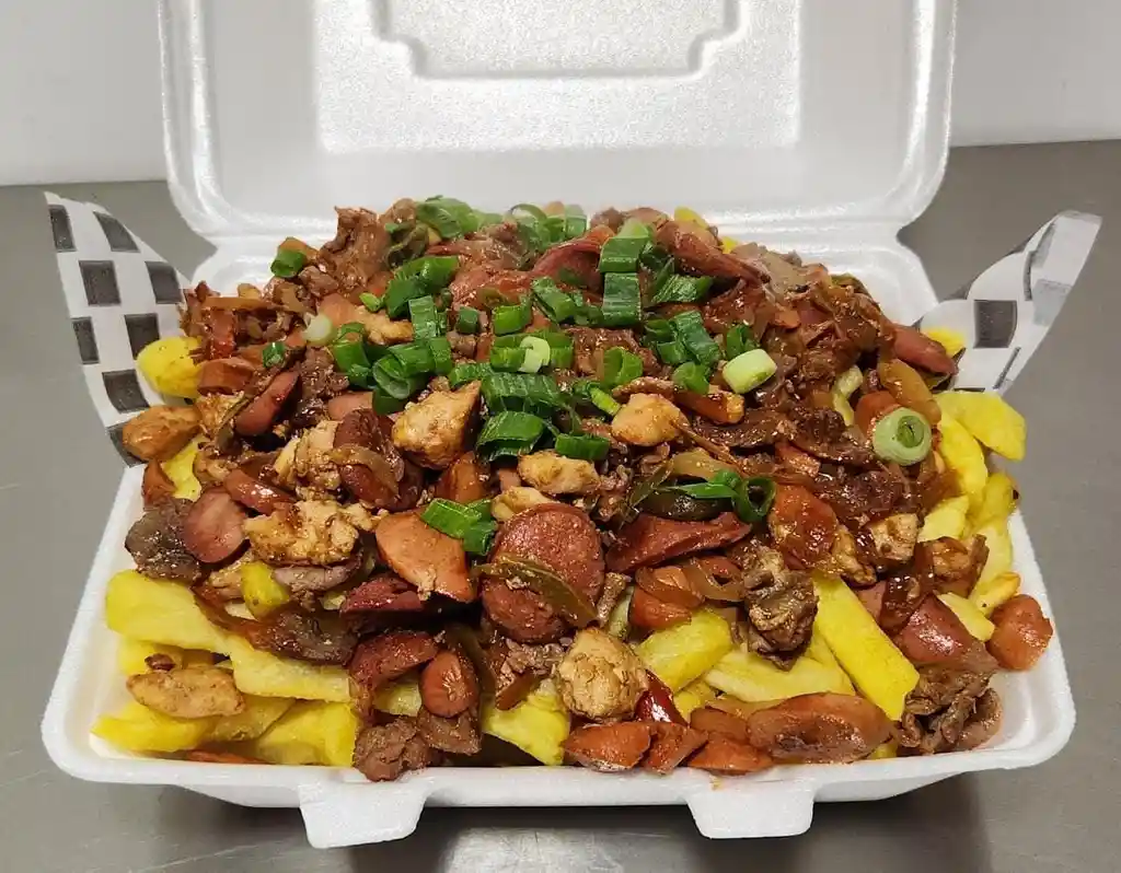 Papas fritas, pimentón, cebolla, vienesa, chorizo, carne y pollo.