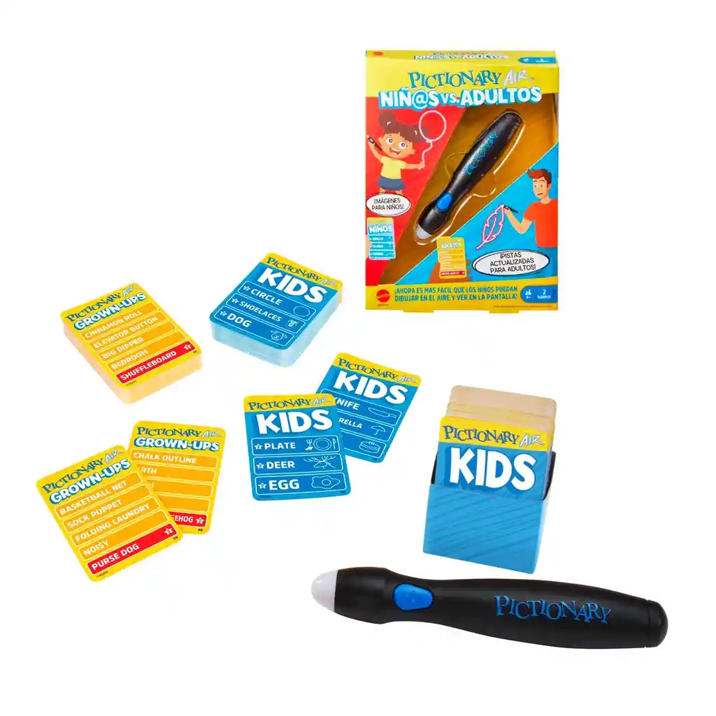 Pictionary Air™ es una manera muy innovadora de jugar al clásico juego de dibujo familiar. Ahora, con Pictionary Air™ niños vs. adultos, a los niños les será más fácil dibujar en el aire y ver sus creaciones en la pantalla. Los adultos usan las pistas clásicas actualizadas, mientras que los niños tienen pistas con ilustraciones, lo que facilita que los niños de tan solo 6 años se unan a la diversión. Interactúa con los dibujos, como en la mímica, para que sea incluso más emocionante que el clásico juego de dibujo rápido. Descarga la aplicación Pictionary Air™ en un teléfono inteligente o una tableta para empezar. Apunta la función de cámara de la aplicación al dibujante y este aparecerá, junto con su boceto, en la pantalla del dispositivo inteligente. Los niños tienen la opción de usar el "modo selfi" de la aplicación para ver sus dibujos. Si quieren reír aún más, los jugadores pueden proyectar sus dibujos desde sus dispositivos inteligentes al televisor mediante Apple TV, Chromecast o un dispositivo de transmisión similar. Se necesita un dispositivo de transmisión compatible. Consulta la página de soporte en línea de Pictionary Air™ para conocer la compatibilidad con dispositivos. Este juego familiar aporta mucha diversión a cualquier noche de juegos o fiesta. Los colores y las decoraciones pueden variar.