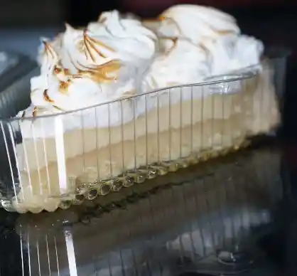 Delicioso trozo de pie de limón casero, con base crujiente de galleta, relleno cremoso y ácido de limón natural, coronado con un suave y dorado merengue. Perfecto para endulzar cualquier momento.