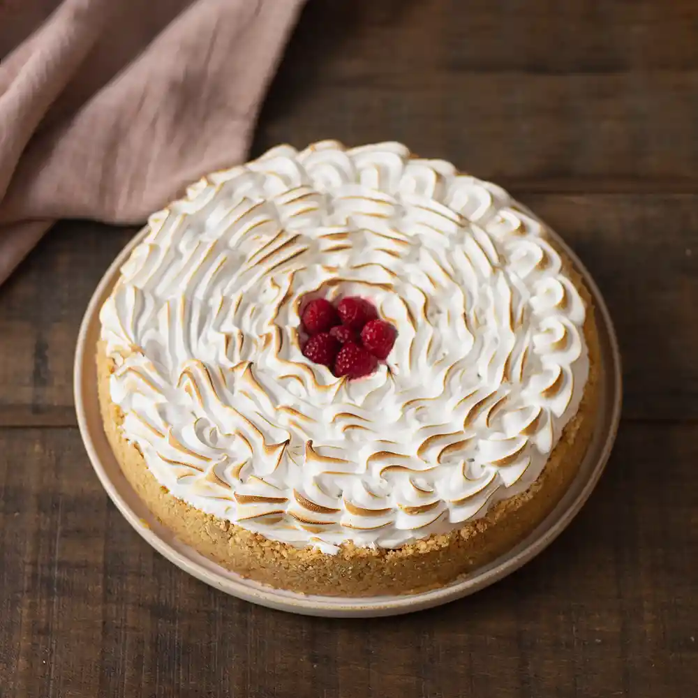 Base de galleta, suave crema de limón con frambuesas en su interior y merengue italiano encima. 10 personas Alto: 3 cm, Diámetro: 22 cm Peso: 1.183 gr Refrigerado: Mantener entre 3-5 °C. Mantener en su emapque, sacar a temperatura ambiente 30 minutos antes de consumir. Duración: 10 días refrigerada. Tiempo de descongelado: 4 horas sin refrigeración Nota: AM La Reina al ser punto de retiro, todos los productos disponibles son congelados