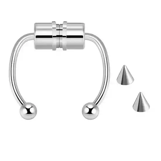 Piercing Magnético no Requiere Perforación. Dos Tipos de Terminales Para Que Puedas Usar el Que Mejor Vaya Con tu Estilo: Esferas y Puntas. Acero Quirúrgico Seguro Para Pieles Sensibles y Previene Reacciones Alérgicas. Tamaño: 17 mm x 16 mm. Diámetro: 13 mm. Elaborado en Acero Quirúrgico. Color: Plateado. 17 cm x 16 cm