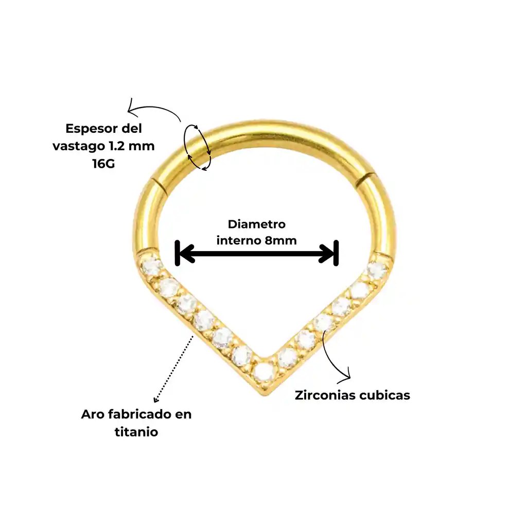 Versátil, brillante y diseñado para durar. Este piercing esta fabricado en titanio grado implante ASTM F136 con recubrimiento PVD, es una joya hipoalergénica de alta calidad, ideal para quienes buscan elegancia sin sacrificar seguridad. Su diseño tipo aro clicker con cierre a presión es cómodo, resistente y fácil de colocar, permitiendo lucir un brillo sofisticado en distintas perforaciones. El acabado dorado obtenido mediante tecnología PVD (Physical Vapor Deposition) no solo otorga un color intenso y uniforme, sino que también aumenta la durabilidad del material y evita el desgaste con el tiempo, manteniendo la biocompatibilidad del titanio. ✨ Características: Material: Titanio grado implante ASTM F136. Color: Dorado con recubrimiento PVD (resistente al desgaste y hipoalergénico). Piedras: Circonias transparentes de alto brillo. Diseño: Aro tipo clicker con cierre a presión. Calibre: 16G (1.2 mm). Cierre: Mecanismo de clic firme y cómodo. 🌟 Ventajas del titanio con PVD: 100% hipoalergénico y apto para pieles sensibles. No se oxida ni pierde su color. Ideal para perforaciones nuevas o cicatrizadas. Mantiene su brillo por más tiempo. 💫 Recomendado para diferentes perforaciones: Septum: Aporta un toque sofisticado con brillo elegante. Daith: Su forma curva se adapta perfectamente al pliegue interno de la oreja. Helix o Rook: Realza el contorno de la oreja con un estilo moderno. Tragus o Snug: Ideal para quienes buscan un aro fino y brillante con ajuste seguro. Lóbulo: Perfecto si prefieres un aro cerrado con brillo sutil. 🎁 Ideal para: Personas que buscan una joya dorada versátil y elegante. Quienes valoran materiales seguros y duraderos. Regalar o complementar un estilo moderno y brillante.