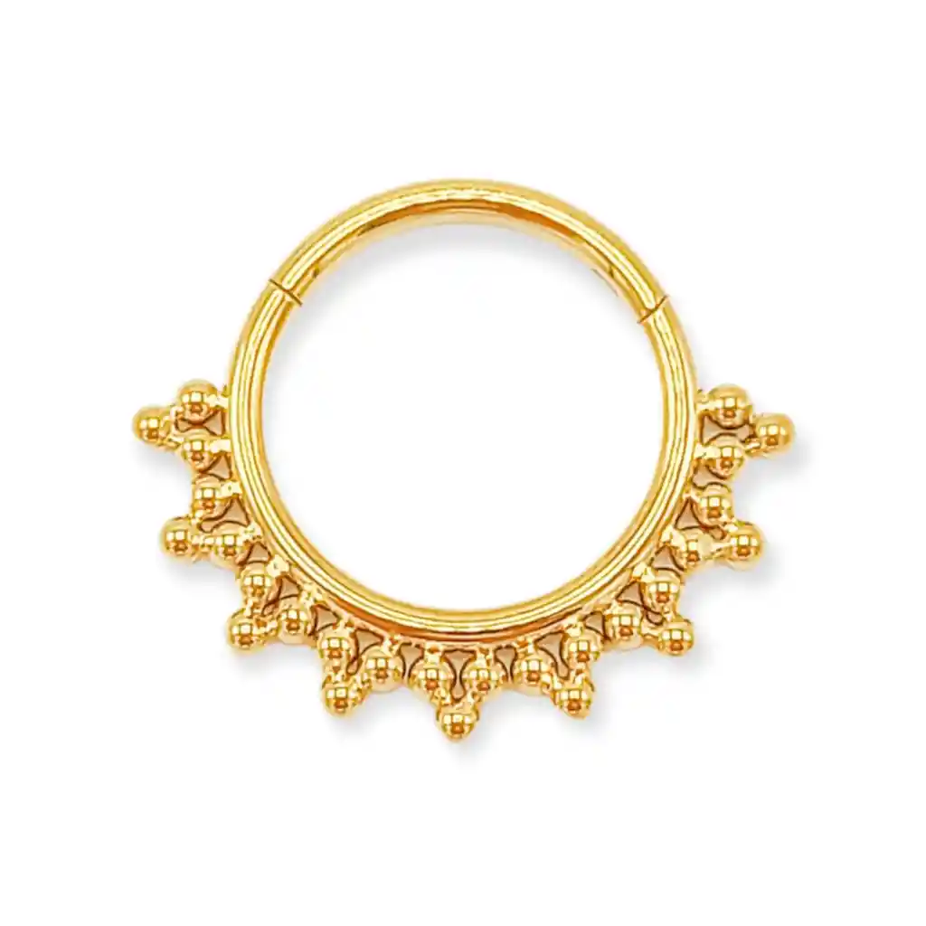 ¡El piercing ideal para tu perforación inicial! O si ya la realizaste y no cicatriza bien tu pieza. Para las perforaciones de septum, hélix, daith, tragus, antitragus, lóbulo. ¿Por qué una pieza de titanio para tu primera perforación? El titanio es el metal más compatible con el organismo humano (considerado como el metal más biocompatible que no es dañino ni tóxico para los tejidos del organismo), hasta el momento no se han reportado reacciones alérgicas del sistema de defensa del cuerpo. Esto significa que los tejidos de tu organismo tolerarán su presencia sin provocarte reacciones alérgicas lo que conjunto a una buena higiene y los cuidados adecuados, te da la seguridad de que tu pieza podrá sanarse de la forma más correcta. Además de esto, cicatriza 3 veces más rápido que otros materiales gracias a su efecto espejo el cual es un tipo de acabado que se le da a la superficie de la joya. Otras características que hacen que el titanio sea de las mejores opciones es que no se oxida, debido a que una de sus cualidades es su resistencia a la corrosión de los fluidos corporales (sangre, saliva, entre otros) debido a la formación de una capa pasiva de oxígeno de titanio en la superficie de la aleación, incrementando su resistencia a la corrosión de forma natural en presencia de oxígeno. Tampoco contiene níquel y es más ligero que otros materiales. Por eso es el material más indicado para la elaboración de prótesis, ¡Menos duda debe generar que sea el indicado para tu primera pieza! Fabricado en titanium y con un hermosísimo chapado en oro 18k. Se convertirá en una pieza única y necearía para tu baúl de joyas. Es importante que sepas que en el empaque se envía 1 piercing. Cabe destacar que todos nuestros productos son enviados en cajitas o bolsitas de regalo, listos para obsequiar. Características: Material: Titanio chapado en oro 18kl Piedras: Sin piedras Peso aproximado 2 g