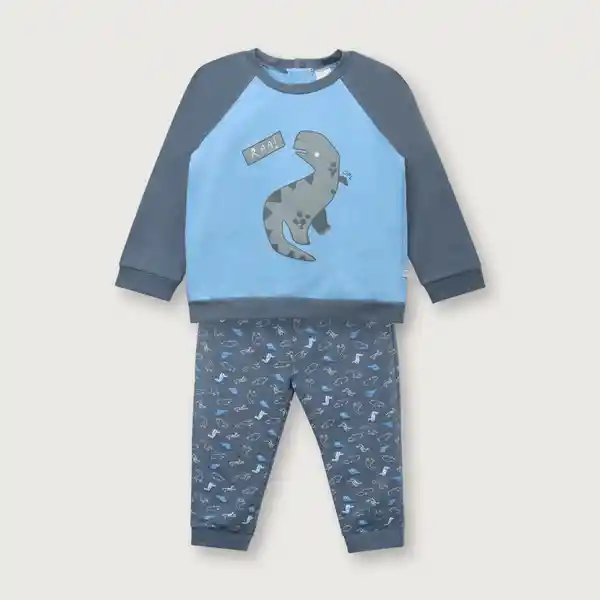 De 2 Piezas Polera Con Estampado Central de Dinosaurio en Color Azul y Celeste y Pantalón Full Estampado.