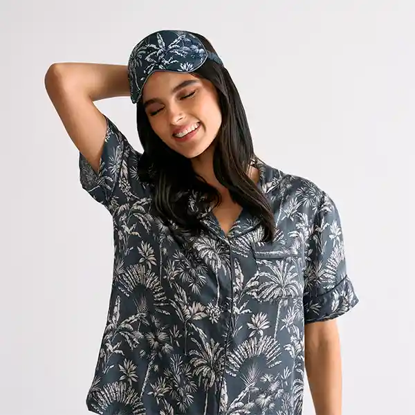 Camisa de dormir de manga larga, diseñada para ofrecer comodidad y estilo atemporal. La parte superior cuenta con un bolsillo frontal, botones para un ajuste práctico y estampado de palmeras.