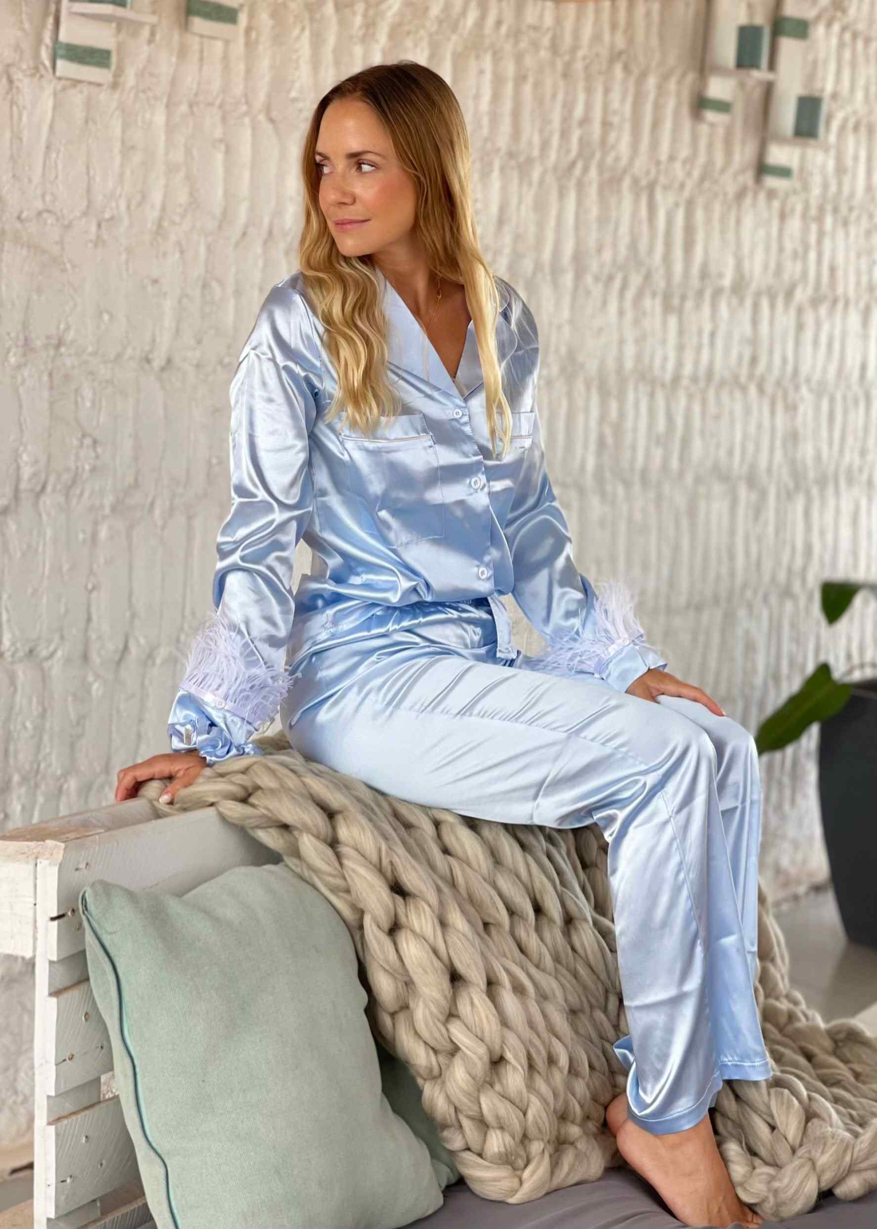 Elegante pijama largo de satén cielo. Incluye blusa abotonada y las mangas tienen plumas que se ponen y sacan para lavado. Scrunchie de Regalo!