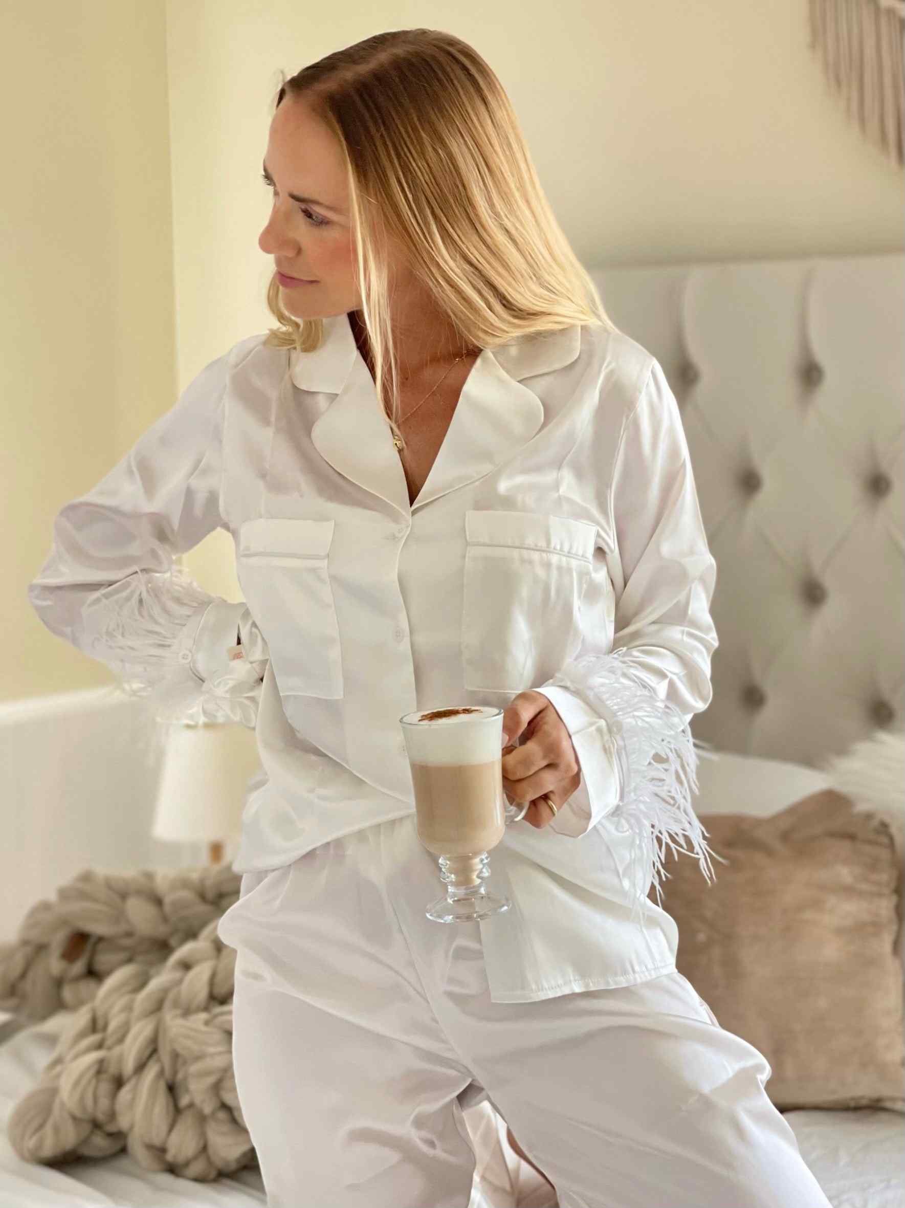 Elegante pijama largo de satén Blanco. Incluye blusa abotonada y las mangas tienen plumas que se ponen y sacan para lavado. Scrunchie de Regalo!