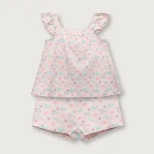 Pijama Opaline Contiene 2 Unidades. Polera Manga Corta Con Vuelitos Con Full Estampado de Minnie en Tonos Rosado Morado y Celeste Con Short al Mismo Tono.
