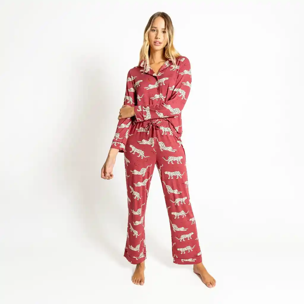 Conjunto de pijama largo. Camisa manga larga y pantalón elasticado con cordones para ajustar.