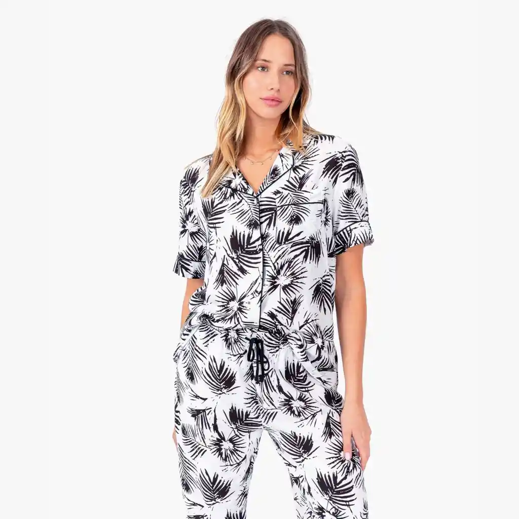 Conjunto de pijama largo. Camisa manga corta y pantalón elasticado con cordones para ajustar.