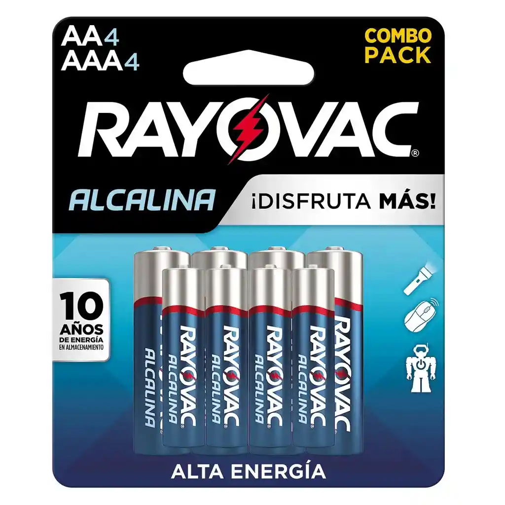 Pilas Alcalinas 4xAA y 4xAAA. Las pilas alcalinas RAYOVAC® ofrecen lo ultimo en energia y ahorro para la confiabilidad en los dispositivos que usa cada dia, RAYOVAC® alcalina proporciona energia que dura tanto tiempo o mas que la competencia a un precio justo. Sello Inteligente: Sello de alta ingenieria que brinda mas espacio para los ingredientes activos. Avanzados anillos de energia: Caja altamente eficiente para contener y entregar con seguridad la maxima potencia de energia