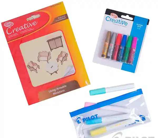Set Pilot Incluye: Muebles en Miniatura Armable Para Pintar + Marcador Pintor Multisuperficie de Colores 4 Und + Glitter Glue de Colores 6 Und.