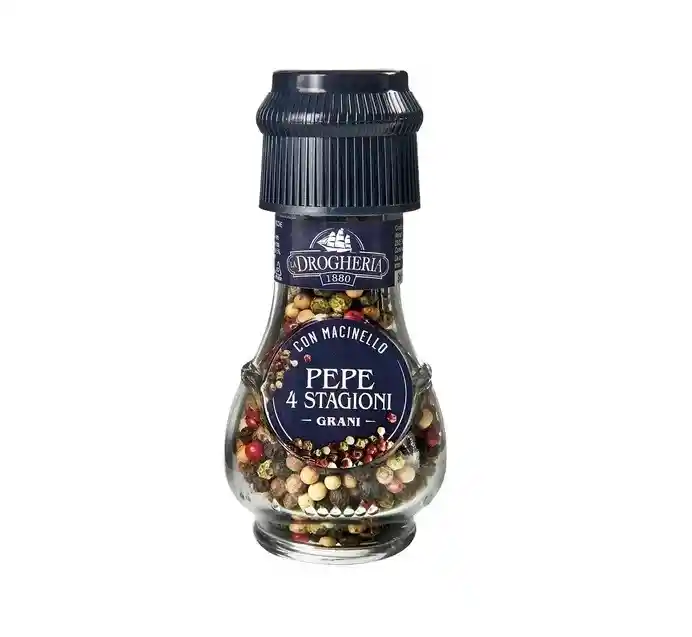 La pimienta de las 4 estaciones tiene un sabor único y un aroma intenso. Fue creado para contener los mejores matices de sabor de las diferentes variedades de pimiento en un solo producto. Esta mezcla combina el fuerte sabor de la pimienta negra, el refinado picante de la pimienta blanca, el sabor fresco y aromático de la pimienta verde y la delicada nota de la pimienta rosa. Frasco de vidrio con molinillo. Hecho en Italia.
