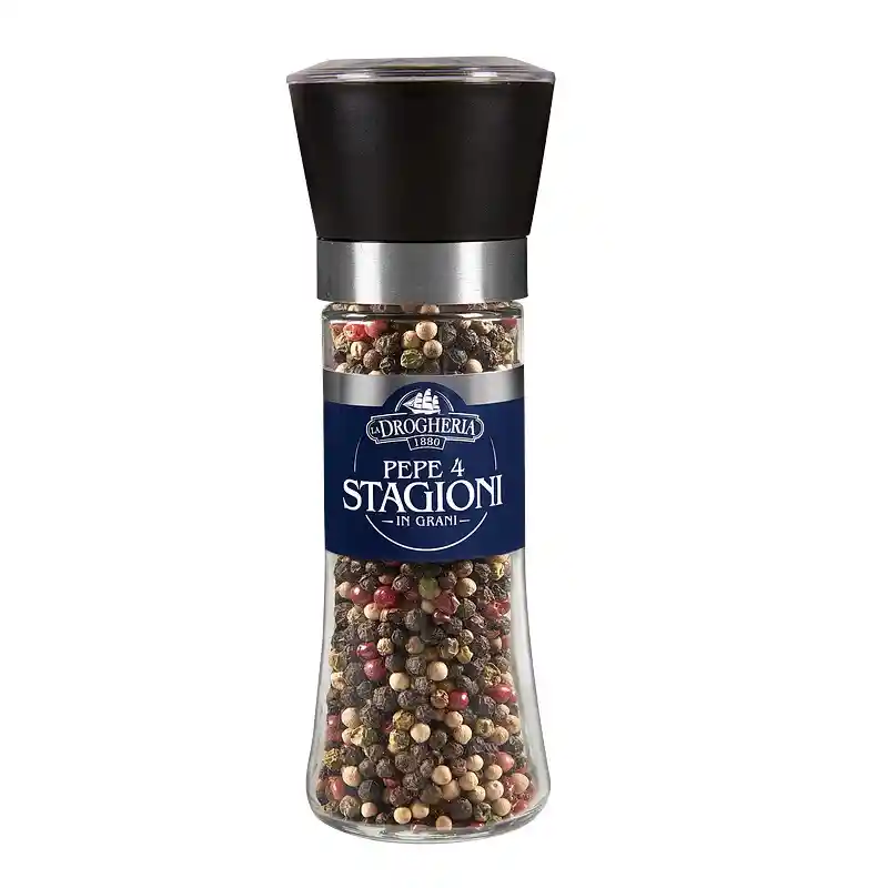 Sabor y perfume unicos de pimientas enteras blancas, negras, verdes y rojas. Molinillo de vidrio recargable y regulable de 15 cm Ingredientes principales: Pimientas negra, blanca y verde (95%) y pimienta roja (5%)