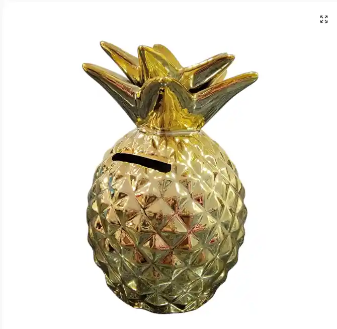 Con nuestra Piña alcancía decorativa dorada le darás un toque de glamur a tu hogar, es Ideal para ambientar tus espacios y darle un estilo especial. – Medidas: 20 cm de alto – Material: resina.