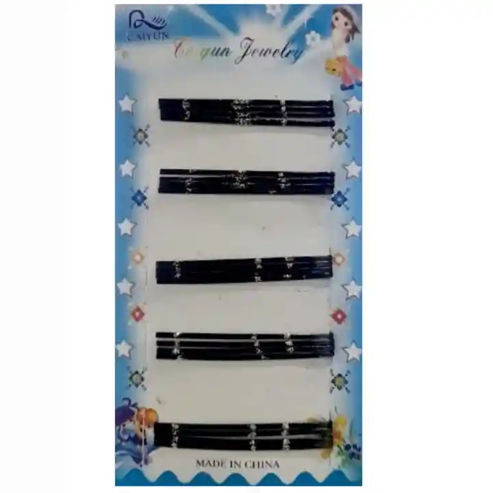 Pinches de 8 cms x 9mm de espesor. Display de 20 pinches. Color Negro con detalle de escarcha.