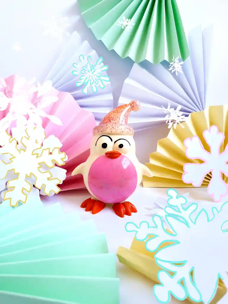 Pingüino pintado a mano y cubierto en chocolate a elección. En su interior lleva una selección de grageas. Peso 320 grs aprox.