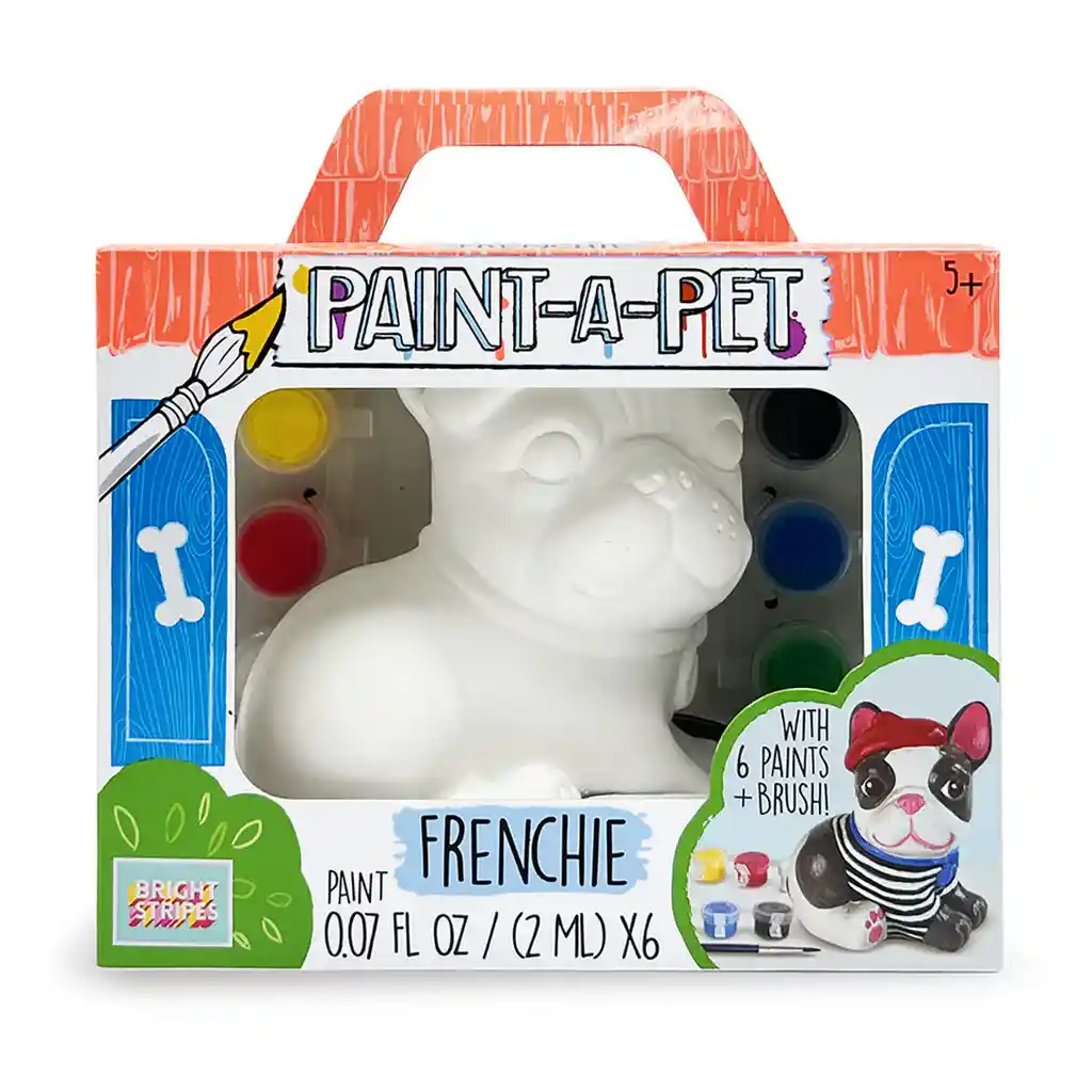 ¡Llévate a casa esta mascota Frenchie de yeso en su propio estuche de transporte! El adorable Bulldog Francés lleva boina y pañuelo. Personaliza tu nuevo cachorro con pinturas acrílicas brillantes. 6 colores de pintura son de 2 ml cada uno. ¡Sé creativo y agrega muchos detalles divertidos para darle vida a tu personaje! La actividad perfecta para fiestas de cumpleaños o tardes artesanales. La pintura de colores brillantes se seca en minutos, ¡lista para exhibir en su escritorio o mesita de noche! Recomendado para: + 5 años