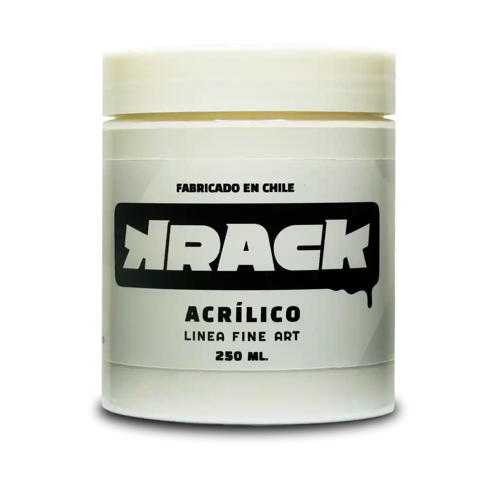 Pintura acrílica base al agua fabricada en Chile de la línea Fine Art de la marca Krack. Disponible en 33 colores en formato de 250 ml. Su textura cremosa y acabado de alta calidad la hacen ideal para usar en canvas, madera, tela, papel, zapatillas, vidrios y otras superficies. Rendimiento aproximado de 3 metros cuadrados por tarro de 250 ml.