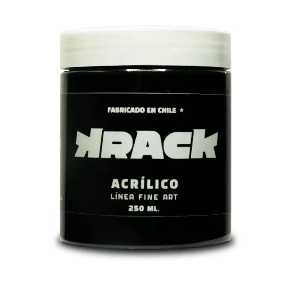 Pintura acrílica base al agua fabricada en Chile de la línea Fine Art de la marca Krack. Disponible en 33 colores en formato de 250 ml. Su textura cremosa y acabado de alta calidad la hacen ideal para usar en canvas, madera, tela, papel, zapatillas, vidrios y otras superficies. Rendimiento aproximado de 3 metros cuadrados por tarro de 250 ml.