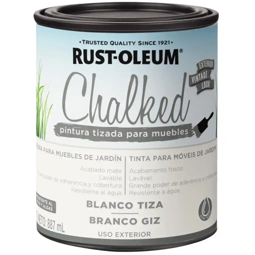Pintura Chalked Tizada Exterior Base Agua 877ml Blanco Tiza. Rust-Oleum Chalked Pintura Tizada Base Agua de Exterior es una pintura muy facil de usar que deja un acabado tizado ultra mate y posee una excelente adherencia y cobertura. Tiene una excelente capacidad de adhesion y cobertura que ofrece un acabado mate, moderno, duradero y lavable. Esta formula brinda proteccion ya que es resistente al agua, al intemperismo, al agrietamiento y descascaramiento. Puede utilizarse como acabado final o para brindar una apariencia "vintage" a un objeto pintado. Base Agua: practicamente no tiene olor, y los elementos utilizados para pintar se lavan facilmente con agua. Gran poder cubritivo . Deja un acabado tizado aterciopelado. Ideal para transformar y renovar objetos y muebles de jardin. Puede aplicarse sobre Ceramica, Concreto, Galvanizado, Madera, Metal, Melamina, Vidrio, Yeso y mas!. Para uso en interior o exterior