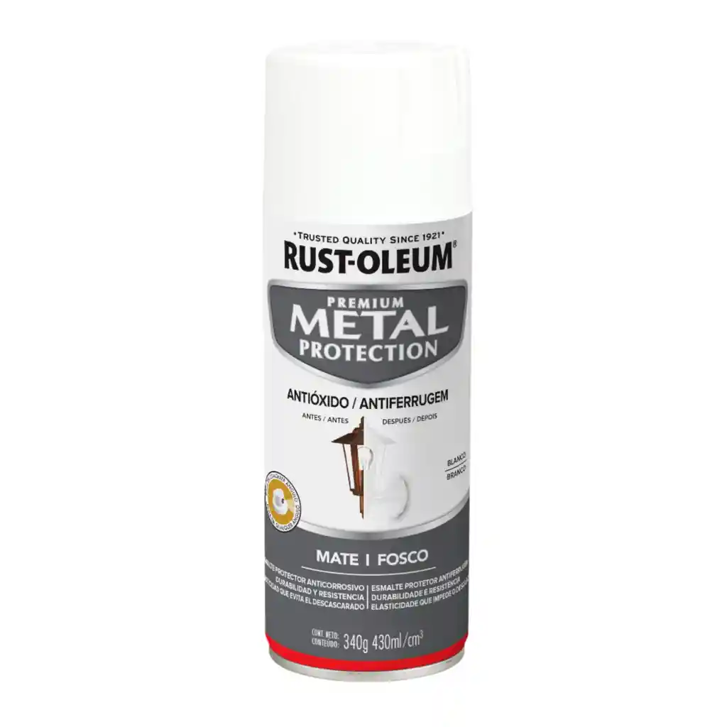 Pintura en Aerosol Metal Protection 340grs Mate Blanco. Rust-Oleum® Metal Protection es un esmalte protector anticorrosivo que se puede aplicar sobre el metal oxidado o para prevenir la oxidacion de objetos y superficies metalicas de interior y exterior. El producto ofrece una gran proteccion al intemperismo y resistencia a la humedad. Incluye una valvula confortable y tecnologia de 360 grados que permite pintar en cualquier angulo. Metal Protection hara que tu proyecto se mantenga como nuevo por mas tiempo. Resistente a la exposicion del sol, lluvia y humedad. Color y Anticorrosivo en un solo paso. Retencion de brillo superior. Maxima adhesion. Extremadamente durable. No se puede aplicar sobre metales galvanizados
