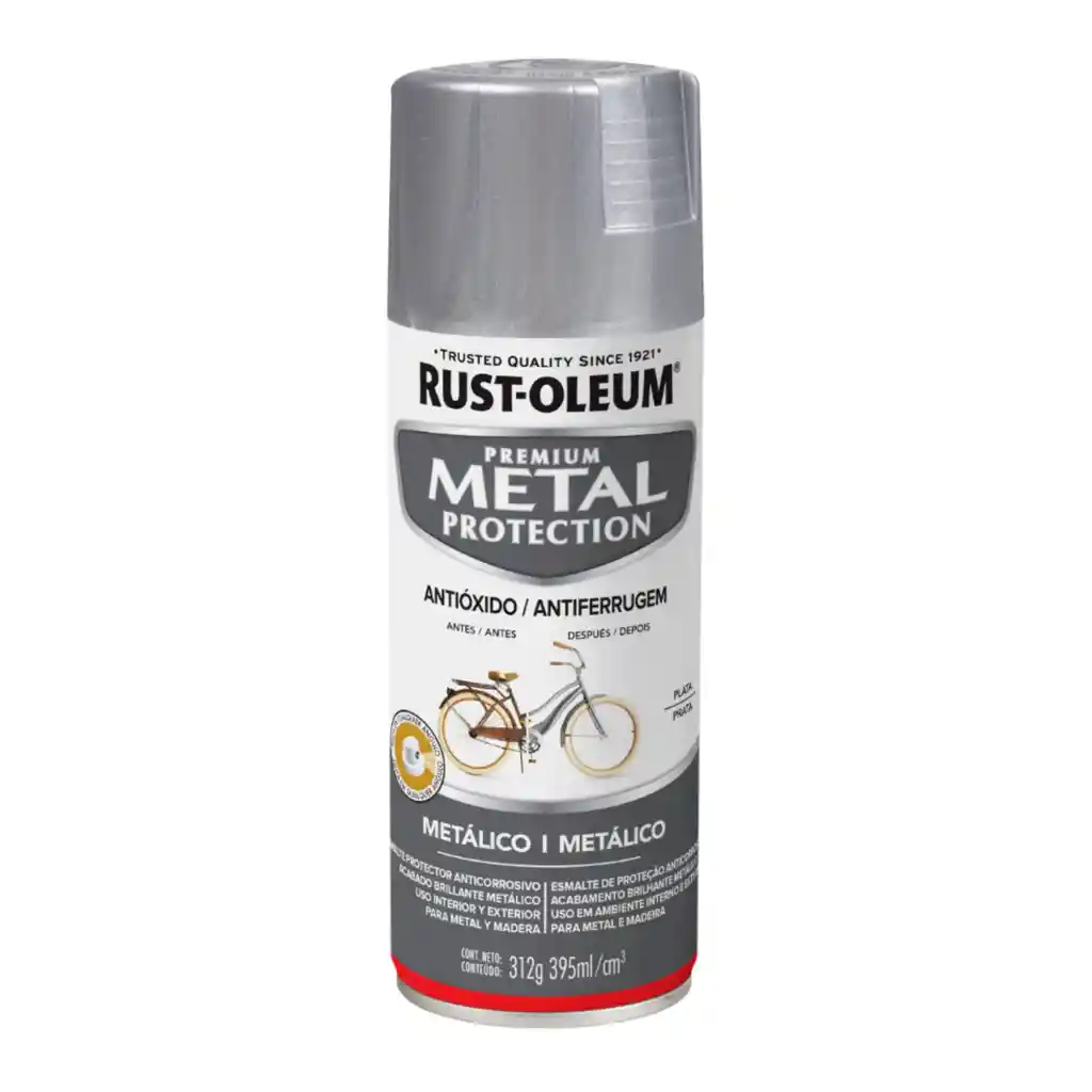 Pintura en Aerosol Metal Protection 340grs Metalico Plata. Rust-Oleum® Metal Protection es un esmalte protector anticorrosivo que se puede aplicar sobre el metal oxidado o para prevenir la oxidacion de objetos y superficies metalicas de interior y exterior. El producto ofrece una gran proteccion al intemperismo y resistencia a la humedad. Incluye una valvula confortable y tecnologia de 360 grados que permite pintar en cualquier angulo. Metal Protection hara que tu proyecto se mantenga como nuevo por mas tiempo. Resistente a la exposicion del sol, lluvia y humedad. Color y Anticorrosivo en un solo paso. Retencion de brillo superior. Maxima adhesion. Extremadamente durable. No se puede aplicar sobre metales galvanizados
