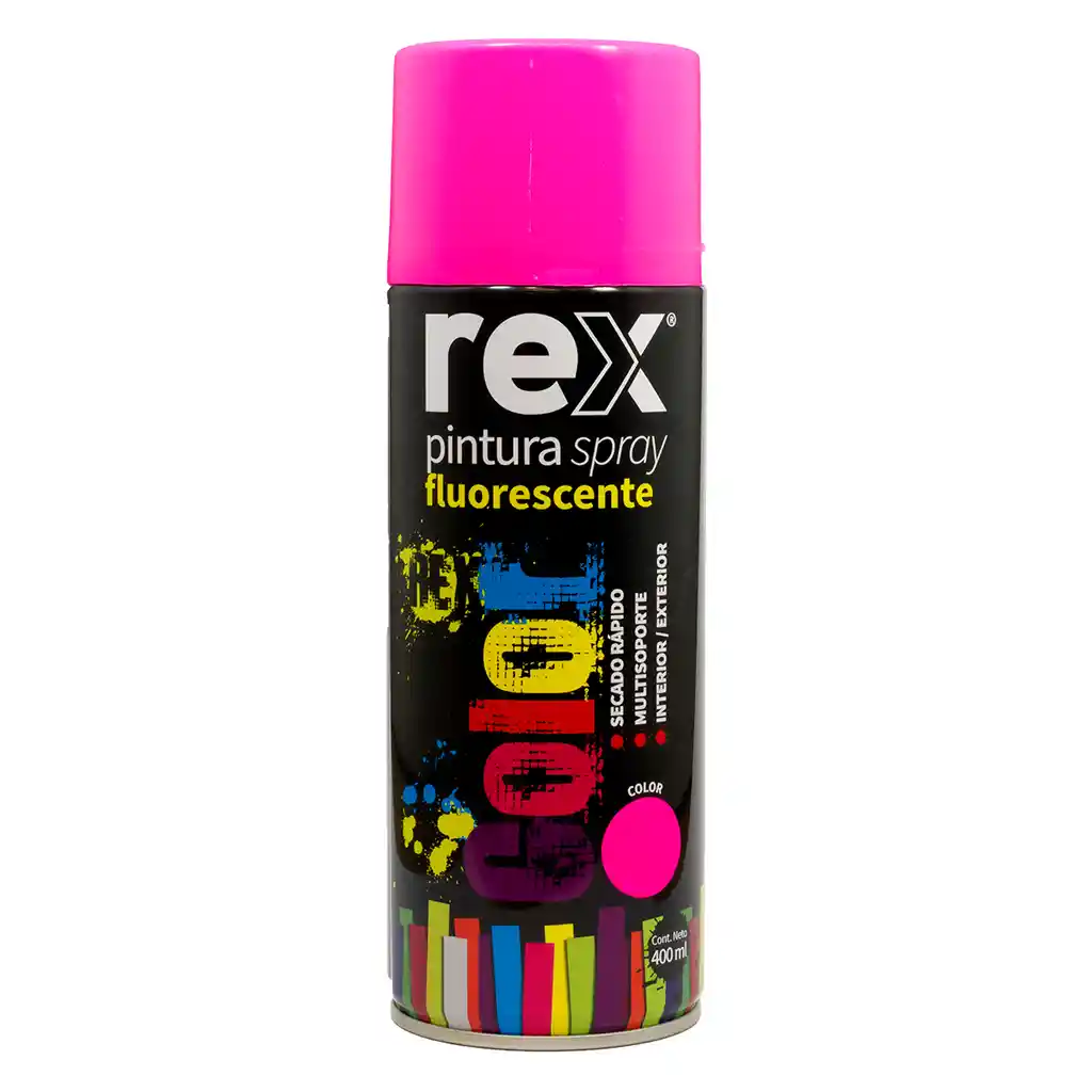 REX Spray Fluorescente de 400 ml, pintura acrílica en aerosol de secado rápido con efecto luminoso de alta intensidad. Desarrollada con tecnología avanzada para brindar colores fluorescentes vibrantes que resaltan al exponerse a la luz, ideal para proyectos decorativos y señalización. Especial para uso en interiores como salones, tiendas, vitrinas, colegios, eventos y espacios comerciales. Apta para aplicar sobre metal, madera, cerámica, yeso, cartón y otras superficies previamente limpias y secas.