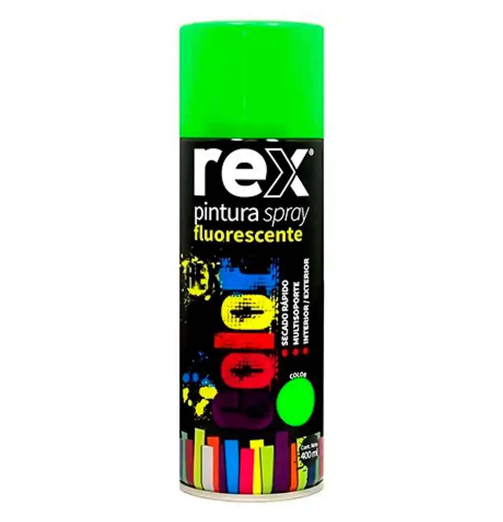 REX Spray Fluorescente de 400 ml, pintura acrílica en aerosol de secado rápido con efecto luminoso de alta intensidad. Desarrollada con tecnología avanzada para brindar colores fluorescentes vibrantes que resaltan al exponerse a la luz, ideal para proyectos decorativos y señalización. Especial para uso en interiores como salones, tiendas, vitrinas, colegios, eventos y espacios comerciales. Apta para aplicar sobre metal, madera, cerámica, yeso, cartón y otras superficies previamente limpias y secas.
