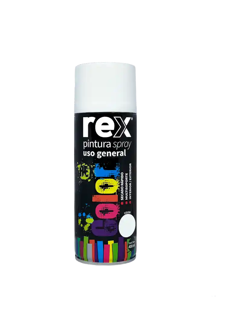 Pintura en spray REX de 400 ml ideal para trabajos de pintura y decoración en interiores y exteriores. Su fórmula acrílica de secado rápido ofrece excelente cobertura, acabado uniforme y alta resistencia a la intemperie. Perfecto para pintar metal, hierro, acero, madera, y yeso, logrando resultados duraderos y profesionales. Ideal para reparaciones, manualidades y proyectos de mejoramiento del hogar. ✔ Secado rápido ✔ Alta cobertura y acabado decorativo ✔ Resistente a la intemperie ✔ Apta para múltiples superficies