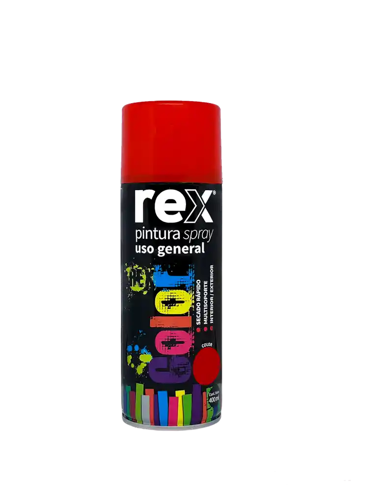 Pintura en spray REX de 400 ml ideal para trabajos de pintura y decoración en interiores y exteriores. Su fórmula acrílica de secado rápido ofrece excelente cobertura, acabado uniforme y alta resistencia a la intemperie. Perfecto para pintar metal, hierro, acero, madera, cerámica y yeso, logrando resultados duraderos y profesionales. Ideal para reparaciones, manualidades y proyectos de mejoramiento del hogar. ✔ Secado rápido ✔ Alta cobertura y acabado decorativo ✔ Resistente a la intemperie ✔ Apta para múltiples superficies