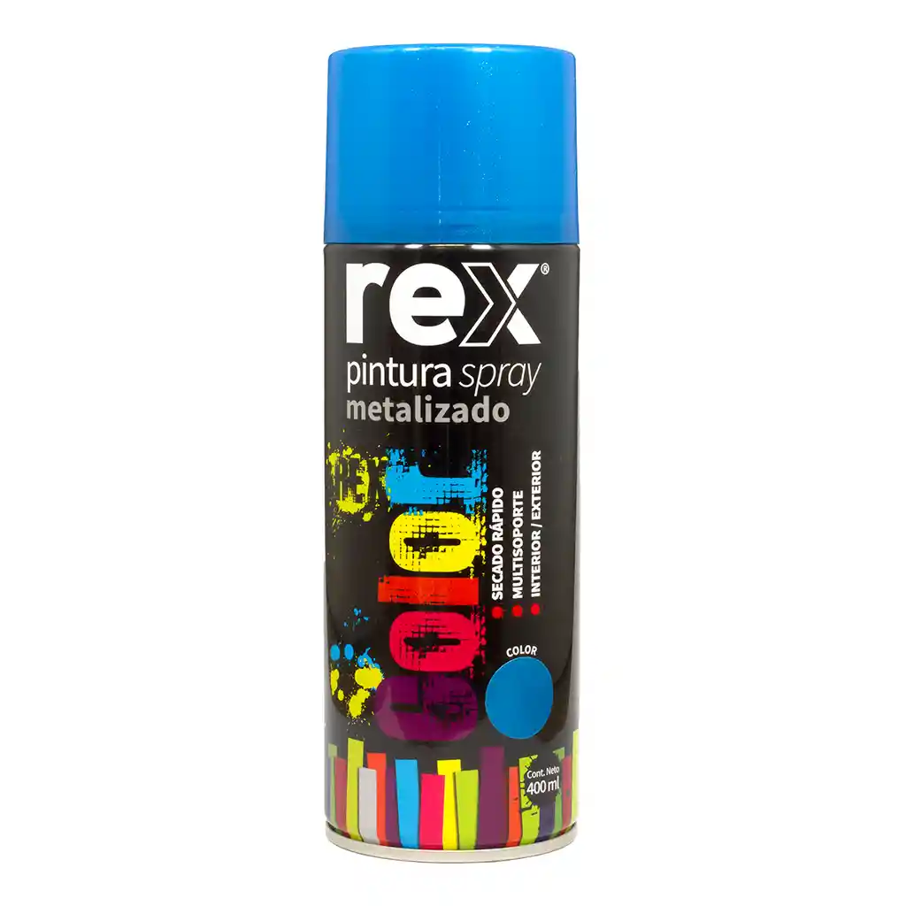 Rex Spray Color Metálico está formulado con resina acrílica de alta tecnología para entregar un acabado metálico brillante y decorativo. Ideal para renovar y embellecer objetos artesanales, decoración de interiores, madera, cerámica y metales. Proporciona excelente adherencia, secado rápido y un acabado uniforme que realza detalles y superficies. Modo de uso: Aplicar sobre superficie limpia, seca y libre de grasa u óxido. Pulverizar a una distancia uniforme aplicando 2 a 3 capas finas, dejando intervalos cortos entre manos. Secado al tacto rápido y curado total en 24 horas. Rendimiento aproximado: 1,7 a 2,1 m² por lata.