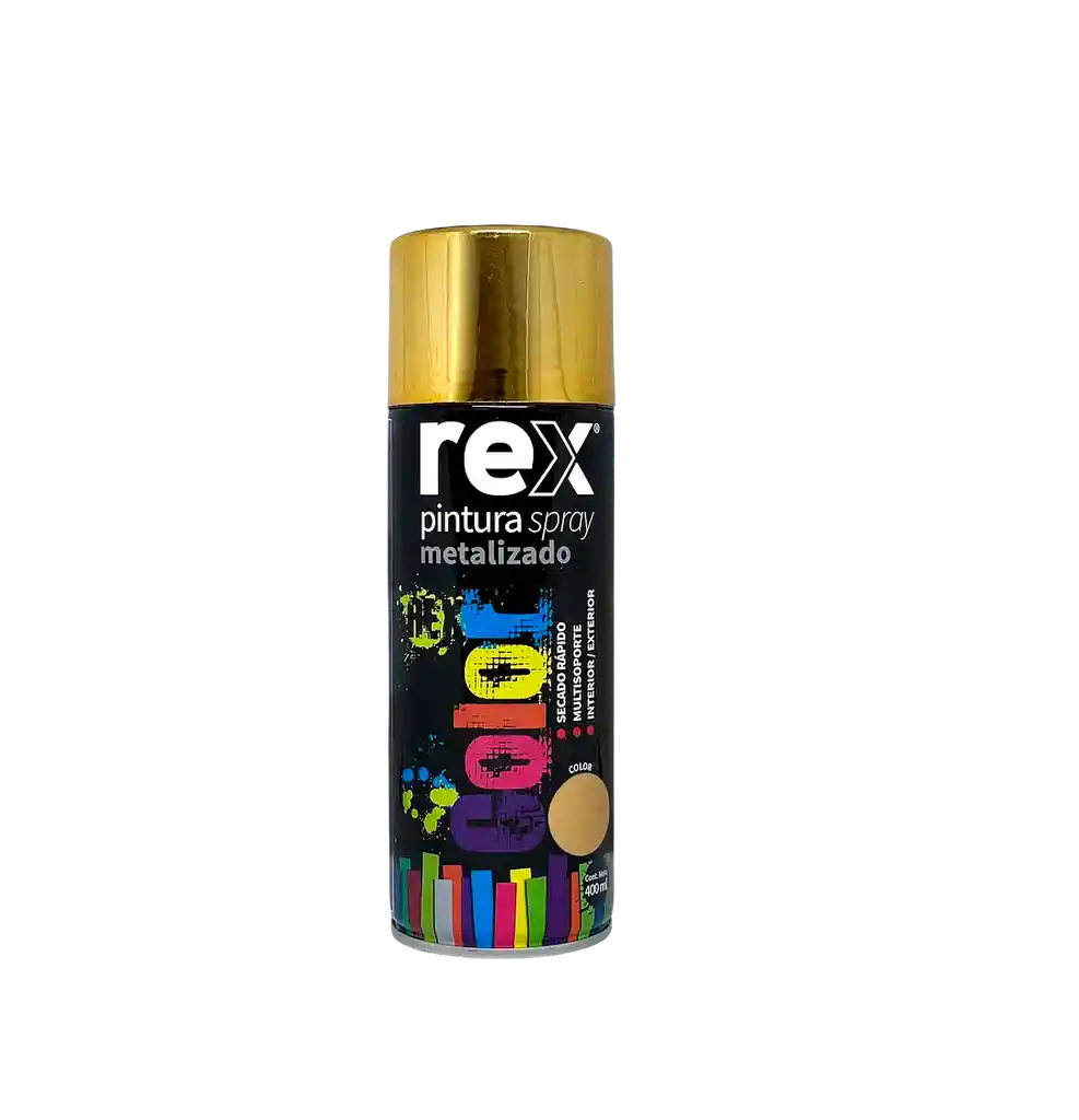 Rex Spray Metálico está formulado con resina acrílica de alta tecnología para entregar un acabado metálico brillante y decorativo. Ideal para renovar y embellecer objetos artesanales, decoración de interiores, madera, cerámica y metales. Proporciona excelente adherencia, secado rápido y un acabado uniforme que realza detalles y superficies. Modo de uso: Aplicar sobre superficie limpia, seca y libre de grasa u óxido. Pulverizar a una distancia uniforme aplicando 2 a 3 capas finas, dejando intervalos cortos entre manos. Secado al tacto rápido y curado total en 24 horas. Rendimiento aproximado: 1,7 a 2,1 m² por lata.